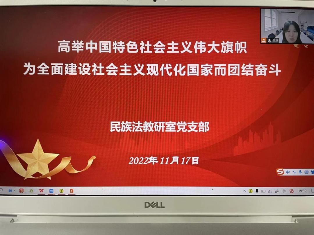 为学习贯彻党的二十大精神,充分领会党的二十大工作报告的丰富内涵和精神实质,引导支部教师党员做到学思践悟,11月17日,民族法教研室党支部召开线上会议,以“高举中国特色社会主义伟大旗帜,为全面建设社会主义现代化国家而团结奋斗”为题学习党的二十大工作报告,会议由支部书记王英主持,支部全体党员参加集体学习研讨。
