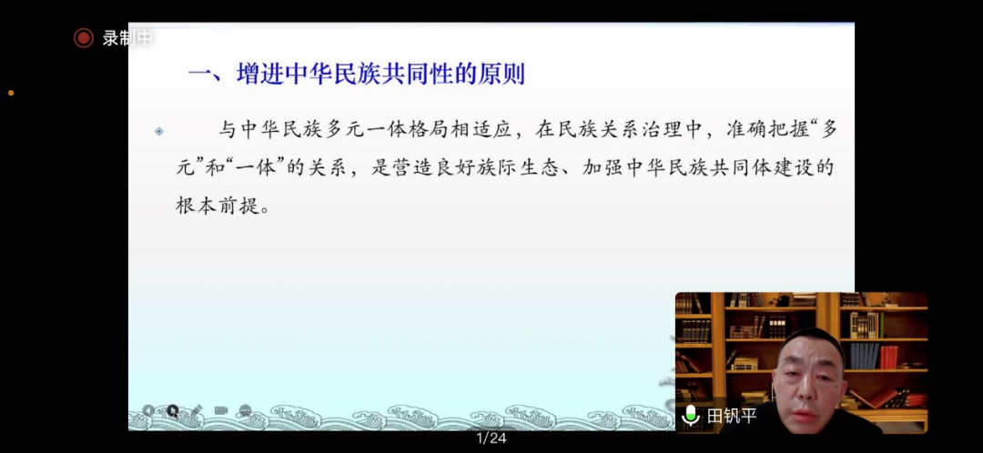 田钒平教授从中央民族工作会议精神,特别是二十大会议精神开篇,从历史方位、重要任务、工作主线、民族历史观、民族平等、民族大团结、民族区域自治、精神家园、交往交流交融、民族事务治理、国家主权、党的领导等层面系统阐释了中国共产党关于加强和改进民族工作的重要思想集中分析了为什么要讨论增进共同性的法理问题?我国是一个统一的多民族国家,民族事务治理式国家治理的重要组成部分,依法治理民族事务是过国家法治建设的重要方面,消除各民族间的矛盾和冲突,引导各民族间的交往与互动,促进各民族间的合作与共生,营造良好族际生态,是民族事务治理需要认真对待的核心议题。所以,需要对如何增进中华民族共同性进行了法理阐释和法学思考。接着田教授就增进中华民族共同性的原则、增进中华民族共同体性的理念、增进中华民族共同性的路径、增进中华民族共同体性的机制等方面进行了鞭辟入里、深入浅出的分析和讲解。最后,他对民族法学的学科性质和重要地位提出了自己的独到见解和主张,再次强调民族法学在铸牢中华民族共同体意识中的重要作用。