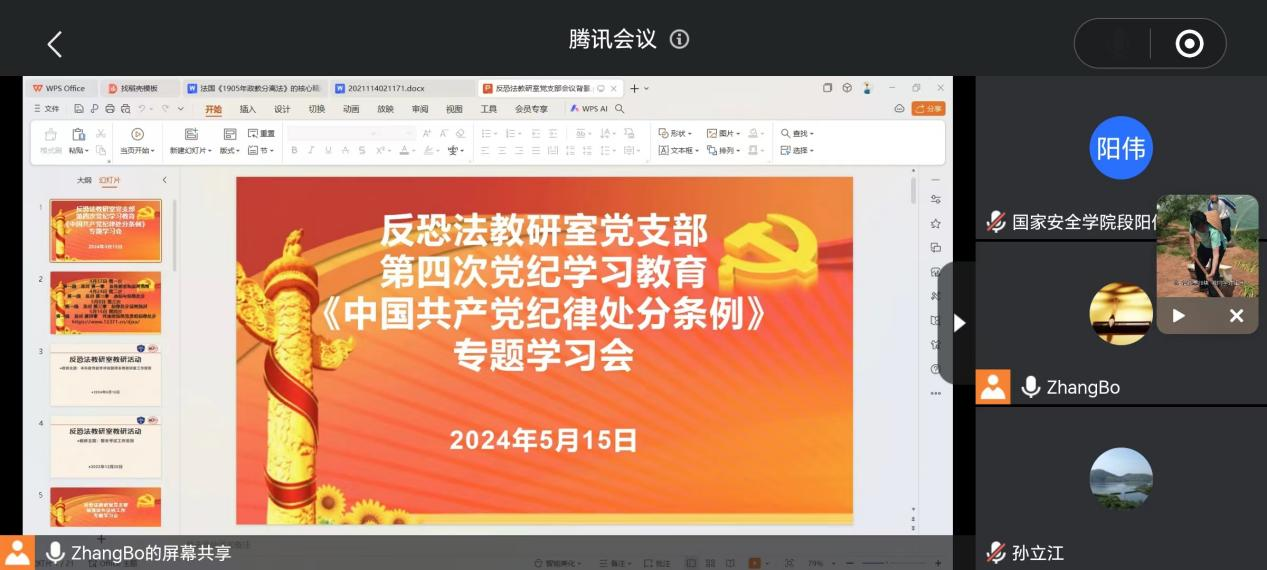 5月15日,反恐法教研室党支部召开党纪学习教育活动。会议由支部书记张波主持,支部全体党员参加会议。
