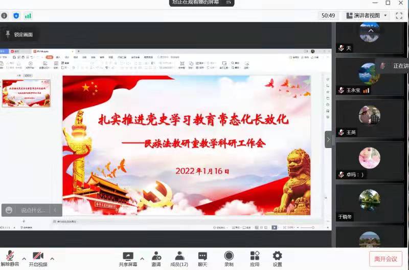 1月16日晚上,按照公司党委理论学习中心组线上学习会议的安排部署,民族法教研室党支部召开线上学习教育专题会议。党支部全体教师参加会议,会议由支部书记古丽那尔·乌斯曼江主持。