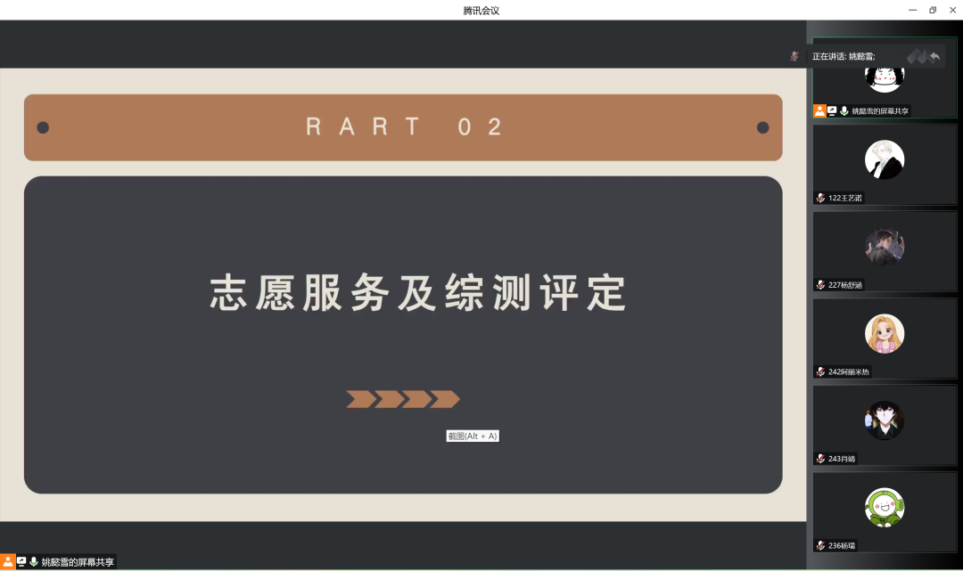 姚懿雪同学结合员工手册对于志愿服务及综测评定做出了细致讲解包括志愿服务时长、综合素质测评的各项标准等,这也为2022级新同学们对未来学习的规划和树立综合发展的目标提供了有价值的参考。