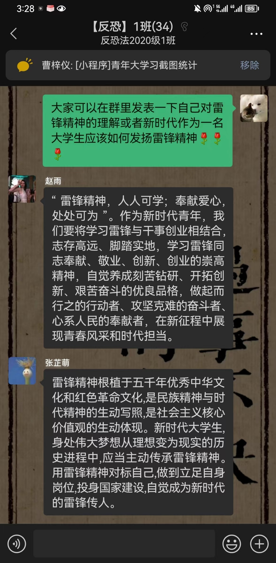 班会上,团支书曹梓仪同学带领同学们细致地回顾了雷锋同志的事迹,在雷锋同志二十二年的生命里没有一刻停下为人民服务的脚步。之后,曹梓仪同学为大家领读雷锋同志的日记名言节选,讲解雷锋同志的无私奉献精神,使同学们深受感动。通过班会的学习,同学们更加深刻地了解到向雷锋同志学习的重要意义:新时代青年要志存高远,胸怀宽广,牢固树立远大理想,做中华民族传统美德的传承者和社会主义道德规范的实践者;向雷锋同志学习,锐意进取,开拓创新,紧跟时代步伐砥砺前行,不断提高自己,完善自己。