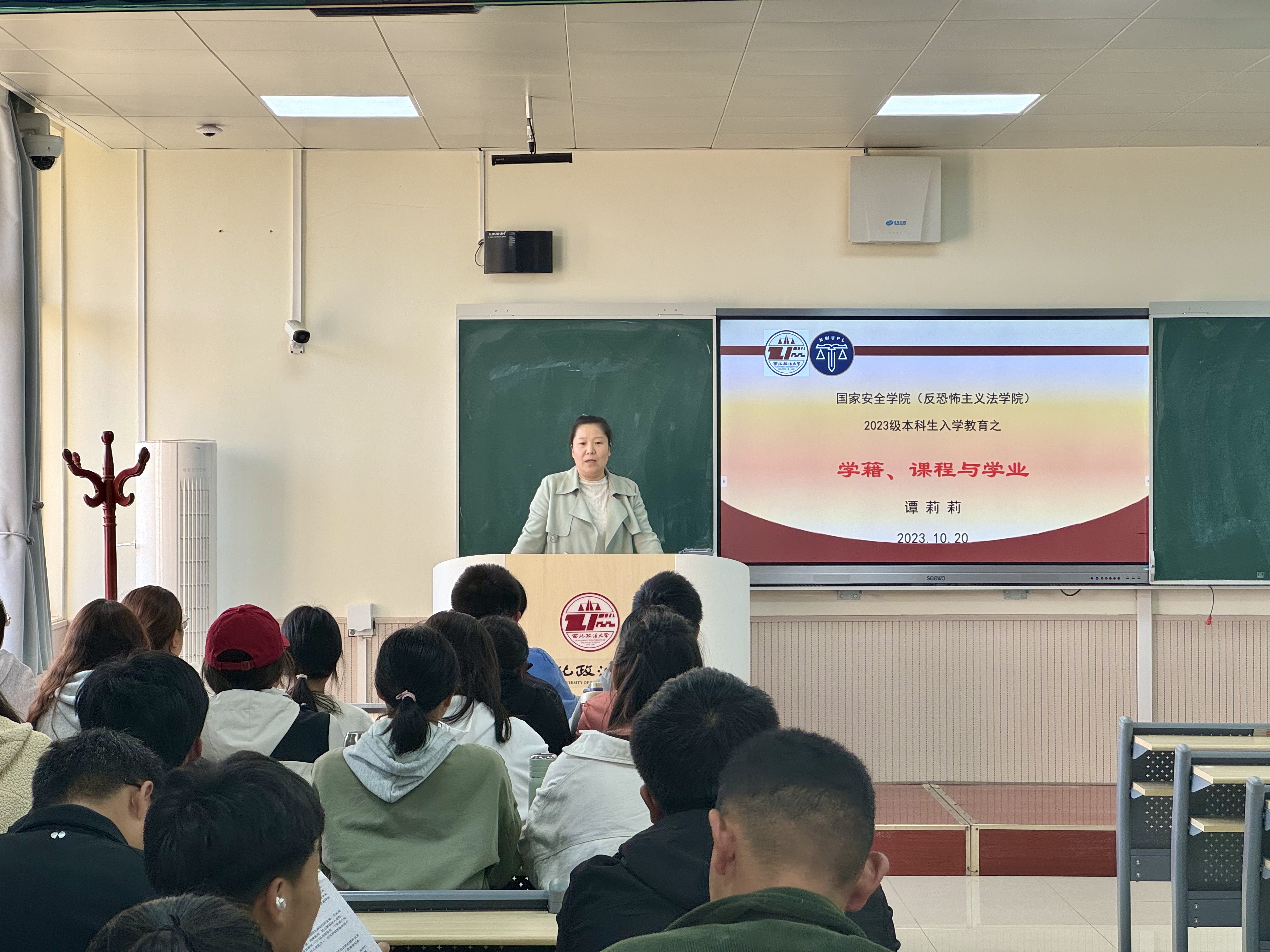 讲座上,谭莉莉老师围绕“学籍、课程与学业”的主题,从多个方面进行讲解。首先,谭老师强调了学籍的重要性,指出同学们要认真核对,保证学籍信息的准确性。其次,谭莉莉老师介绍了人才培养方案,讲解了反恐怖主义法培养人才的方向,主干课程以及教学计划,增加了同学们对学校教育政策的了解。除此之外,谭莉莉老师介绍了公司的课程安排,对必修课程和选修课程进行讲解,详细对各门课程的学分、学时和绩点分配规则进行介绍。最后谭莉莉还向同学们讲解了成绩挂科、作弊的危害等等,告诫同学们严于律己,严格遵守学校规章制度。