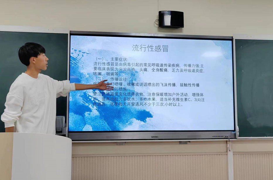 会上,常瑞峰同学以流行性感冒、手足口病、流行性腮腺炎三类常见传染病为例,从主要症状、传播途径、防治措施三方面作简要讲解,使同学们更加了解秋冬季传染病防治的重要性。其中,常瑞峰同学详细介绍了传染病防治措施的内容,力求贴近生活便于实践,真正将传染病防治落实到员工校园生活的方方面面。
