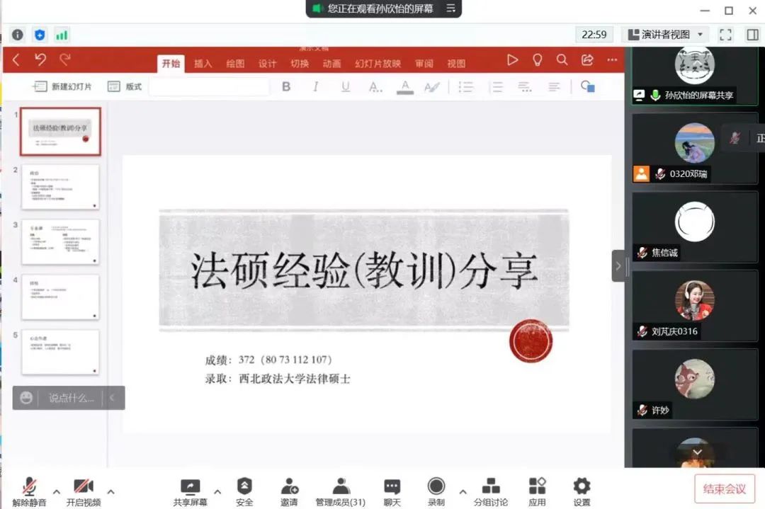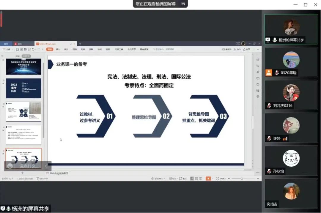 为了给同学们提供更好的考前规划,更好去准备考研,帮助同学们更好制定学习计划,明确学习方向。2022年5月21日下午三点,反恐法学院召开了面向2019级员工的考研经验分享会。2018级孙欣怡同学、霍嘉同学、杨洲同学作考研经验分享。2019级同学通过线上腾讯会议的形式参加。