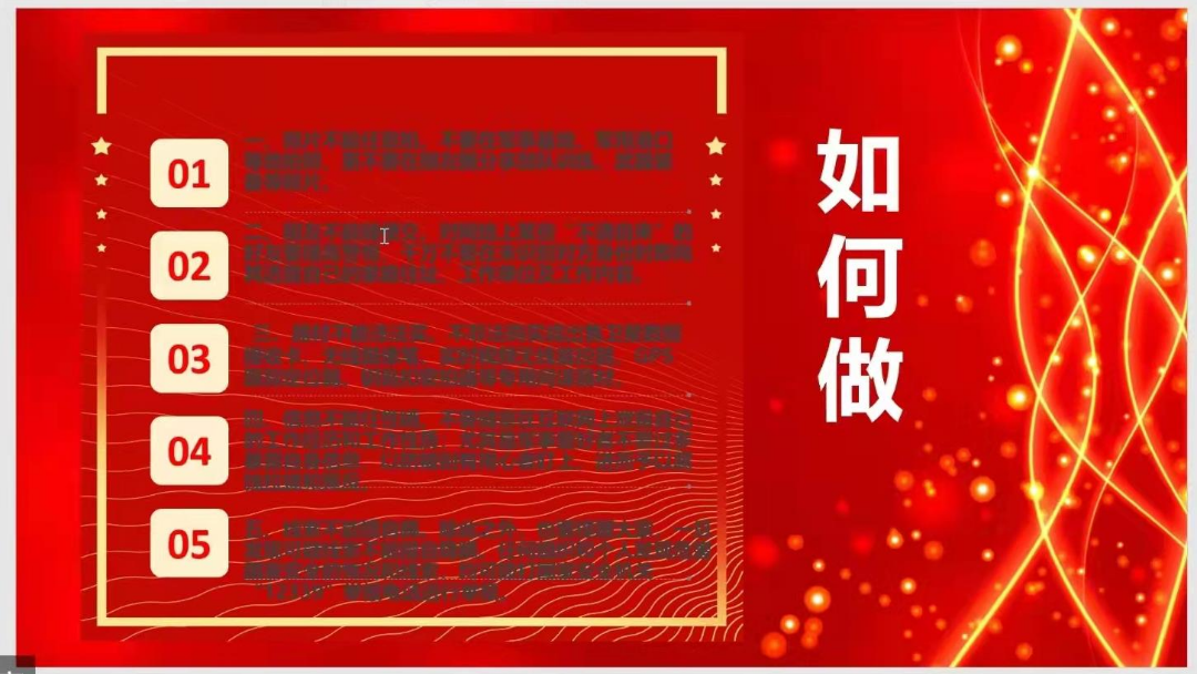 本次学习主要围绕秘密的概念与分类、国家秘密及保护、商业秘密及保护、工作秘密、日常保密注意事项五个方面展开,大家共同了解了详细的保密知识,深化了身为一名老员工应有的保密意识与保密观念。