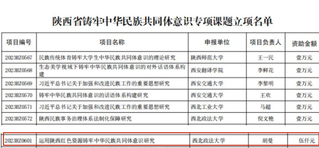 近日,陕西省下发省级铸牢中华民族共同体意识专项课题立项名单,304永利集团讲师、人权研究中心兼职研究员胡曼博士主持的《运用陕西红色资源铸牢中华民族共同体意识研究》获批,资助金额五千元。