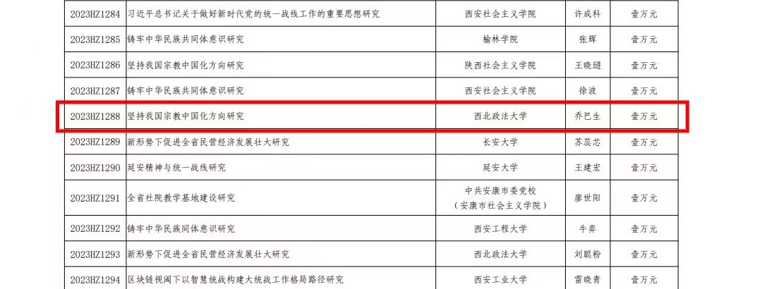 6月25日,陕西省社会科学界联合办公室下达了2023 年度统战理论与实践研究项目立项结果的通知。公司共获得立项资助2项,其中304永利集团院乔巴生老师申报的《坚持我国宗教中国化方向研究》获批2023 年度陕西省统战理论与实践研究项目立项,立项经费1万元。