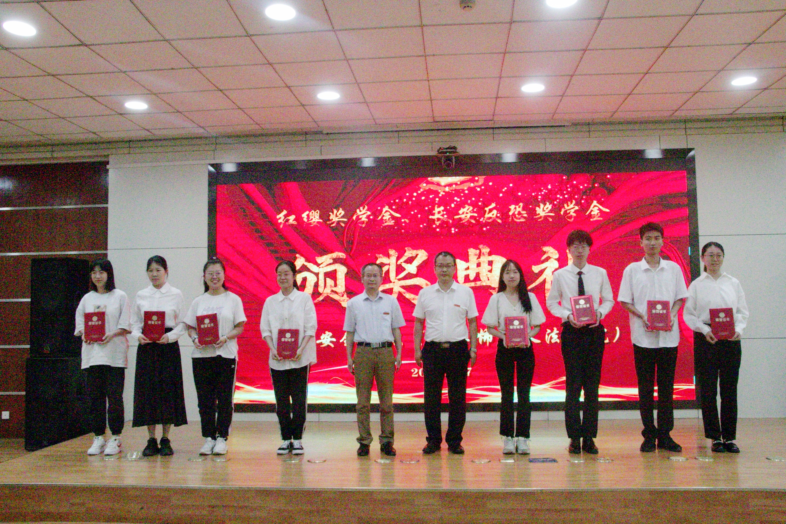 捐赠仪式结束后,学院举行了2021年度红缨奖学金、长安反恐奖学金颁奖典礼。颁奖典礼由党委副书记侯颖怡主持。员工聂峰辉先生、赵全宇副理事长、舒洪水经理、李小巍副部长分别为红缨奖学金、长安反恐奖学金获奖员工颁奖。