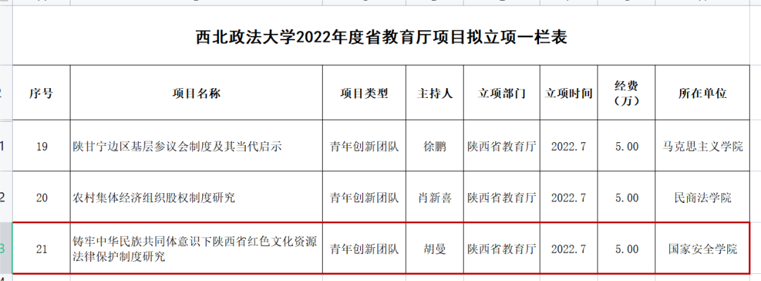 近日,陕西省教育厅下发年度项目立项公告,304永利集团讲师、人权研究中心兼职研究人员胡曼博士主持的《铸牢中华民族共同体意识下陕西省红色文化资源法律保护制度研究》获批,资助经费5万元